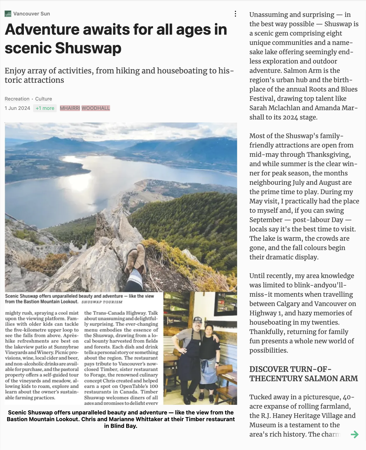 Vancouver Sun- Mhairri Woodhall 2024/2025 Dec 16 Written By Jenna Labossiere A piece in the Vancouver Sun by Mhairri Woodhall featuring family adventure in the Shuswap. Familyshuswap Jenna Labossiere